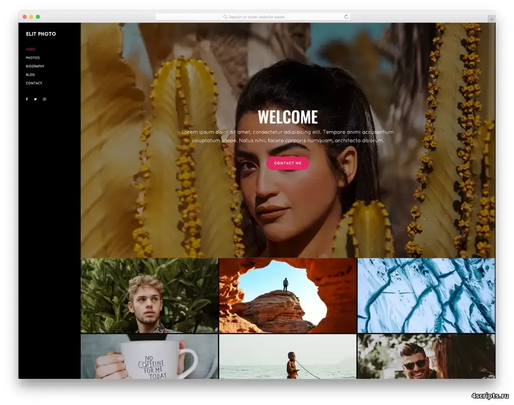 Elit — одностраничный шаблон с креативным тёмным оформлением, созданный для сайтов фотографов. Выглядит стильно, при этом легко адаптируется под любую визуальную тему.